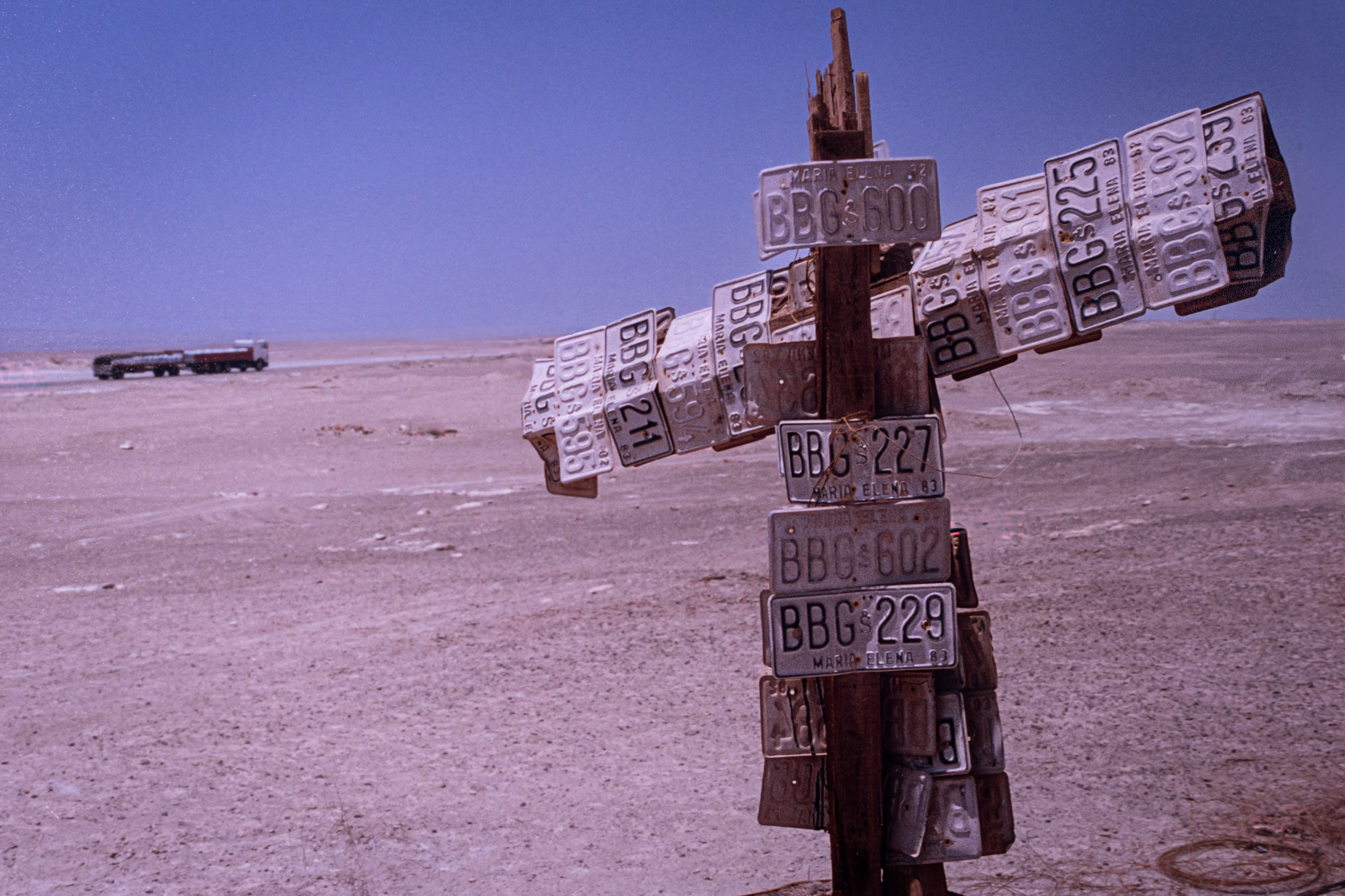 Cruz hecha con matrículas, en el desierto de Atacama, norte de Chile (fotografía analógica, edición digital)