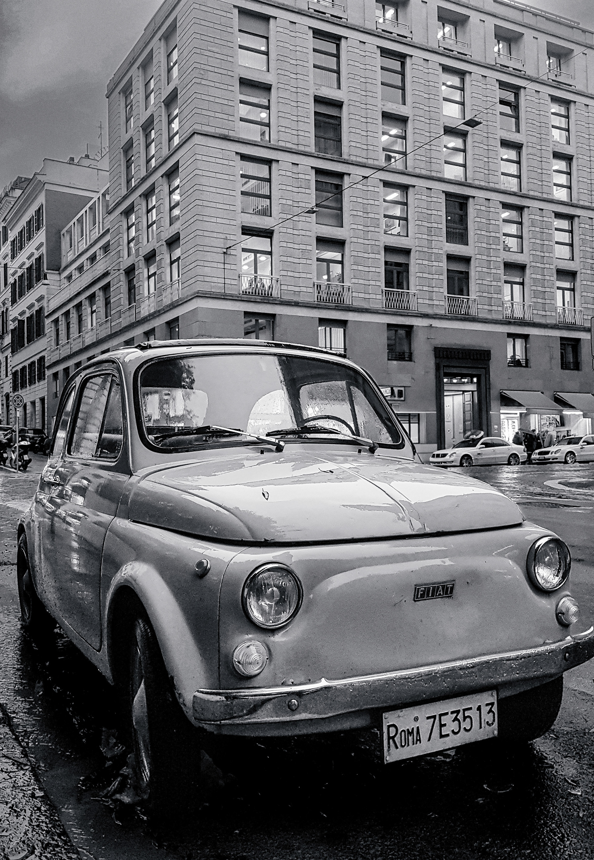 Un bello Fiat 500 en el centro de Roma, Italia.