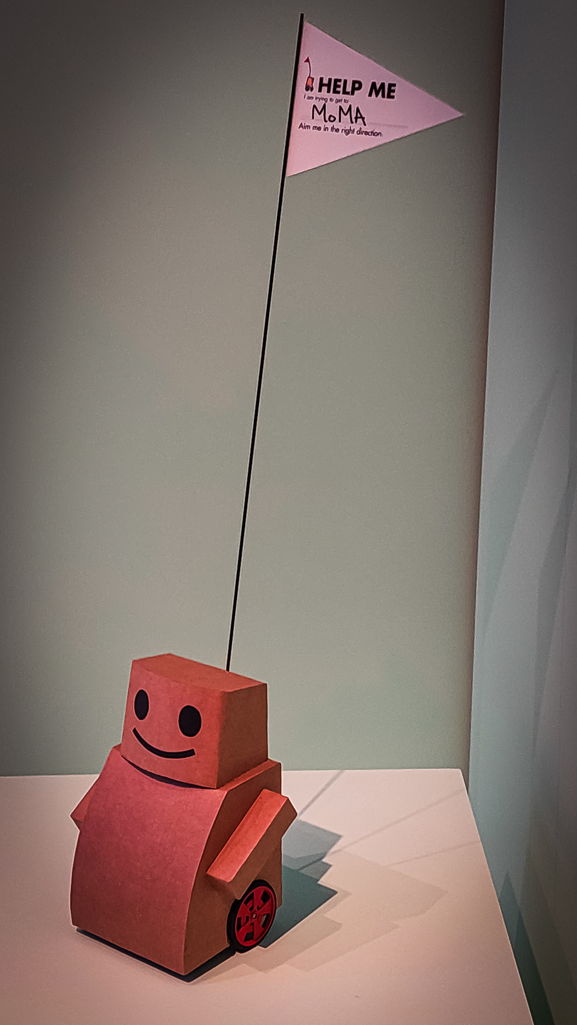 Ahí está, pequeño, tierno, con la simpleza del cartón y esas rueditas de changuito para hacer las compras. En lo alto, el banderín con el pedido de ayuda: “Help me. I am trying to get MoMA. Aim me in the right direction" (“Ayúdame. Estoy intentando llegar al MoMA. Oriéntame hacia la dirección correcta”)