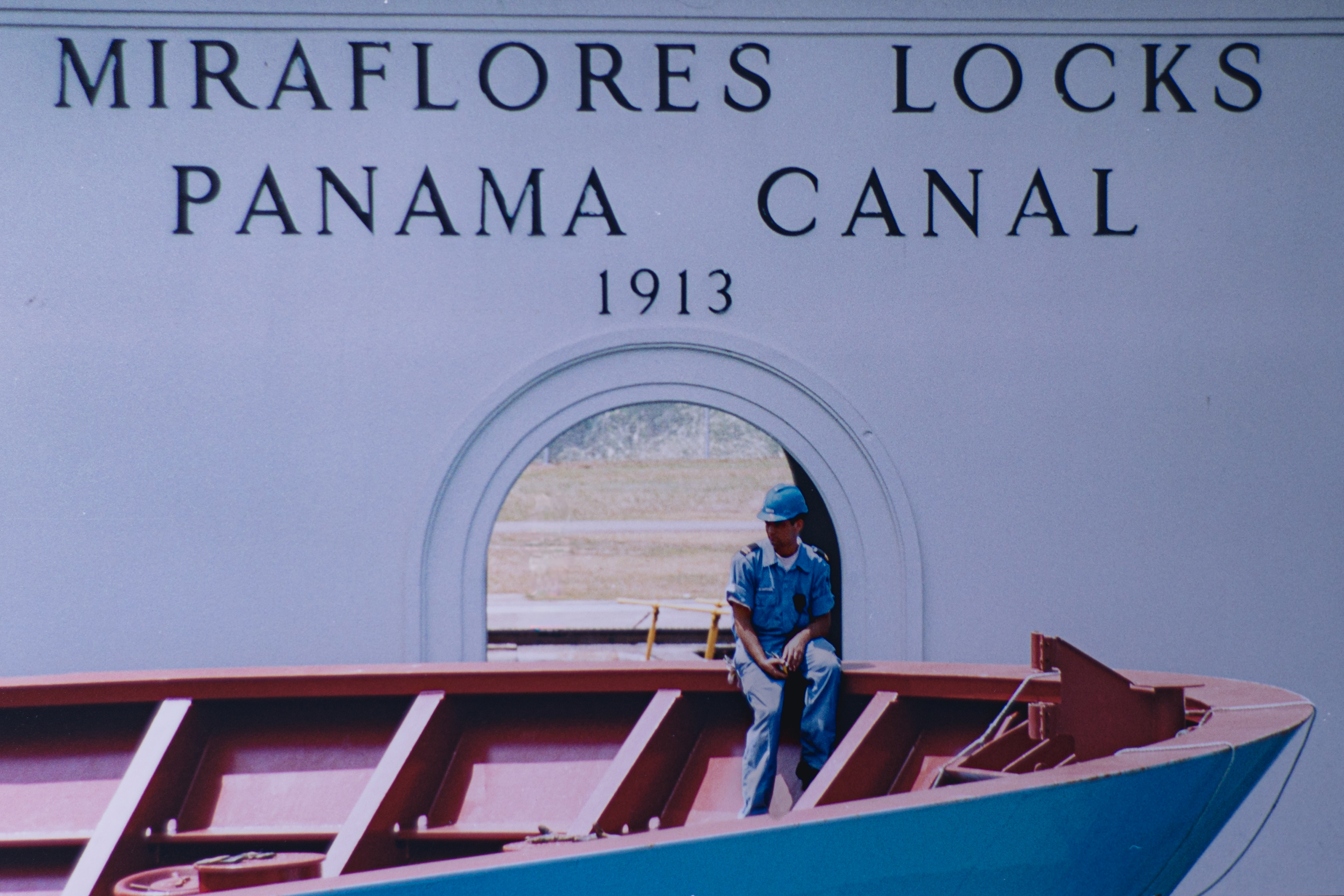 Un operario, en la proa de uno de los barcos. Las esclusas de Miraflores fueron terminadas en 1913.