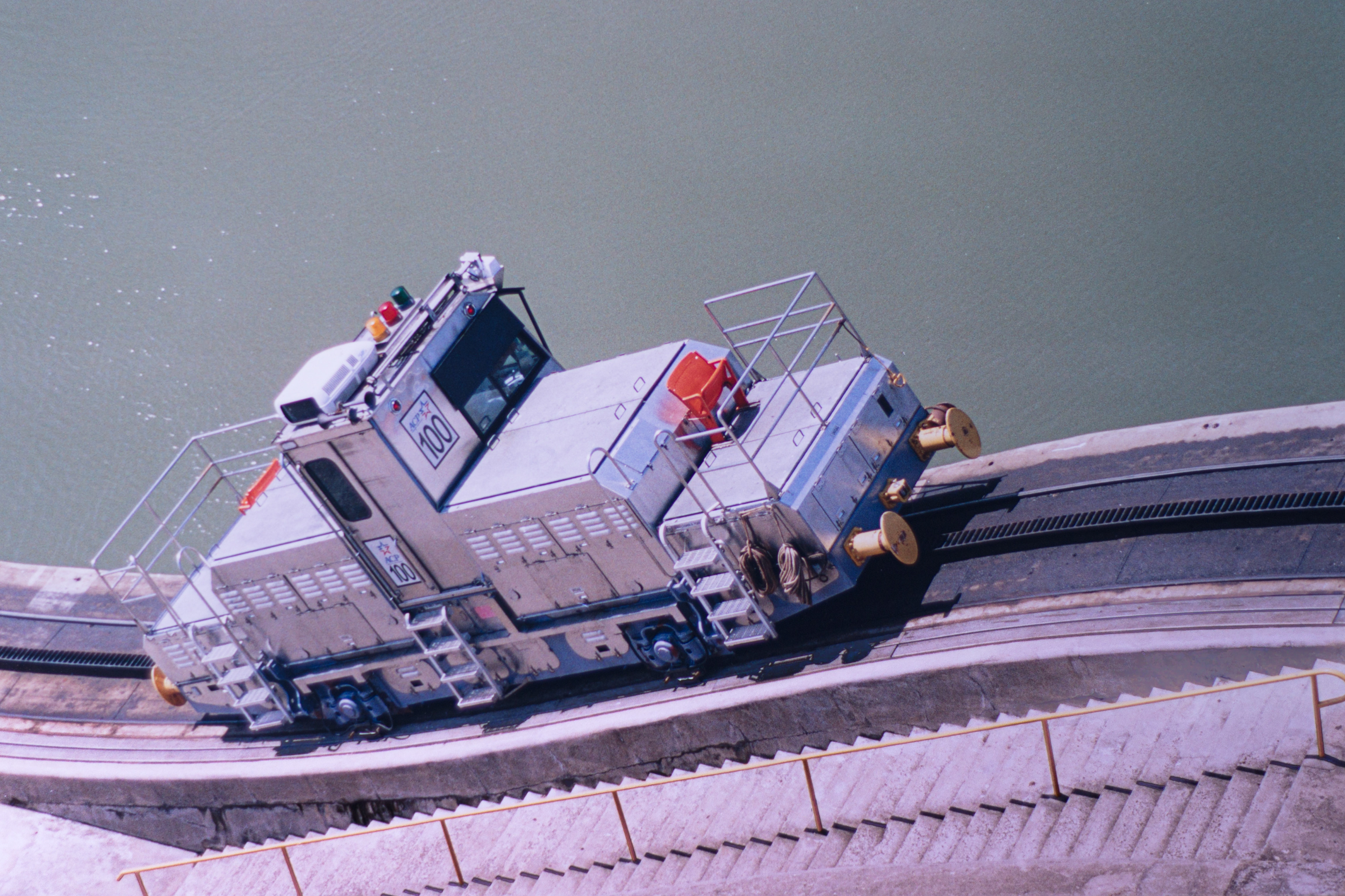 Una de las “mulas” de las esclusas. Estos vehículos se encargan, a través de cables de acero, de mantener alineados a los barcos a lo largo de su paso por el sector.