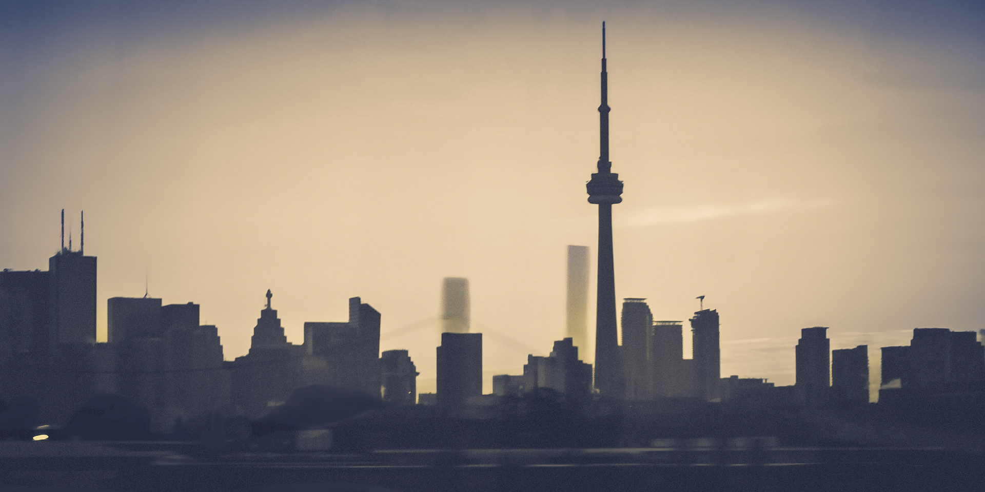 La CN Tower (553m) en el horizonte al amanecer en Toronto, Canadá.